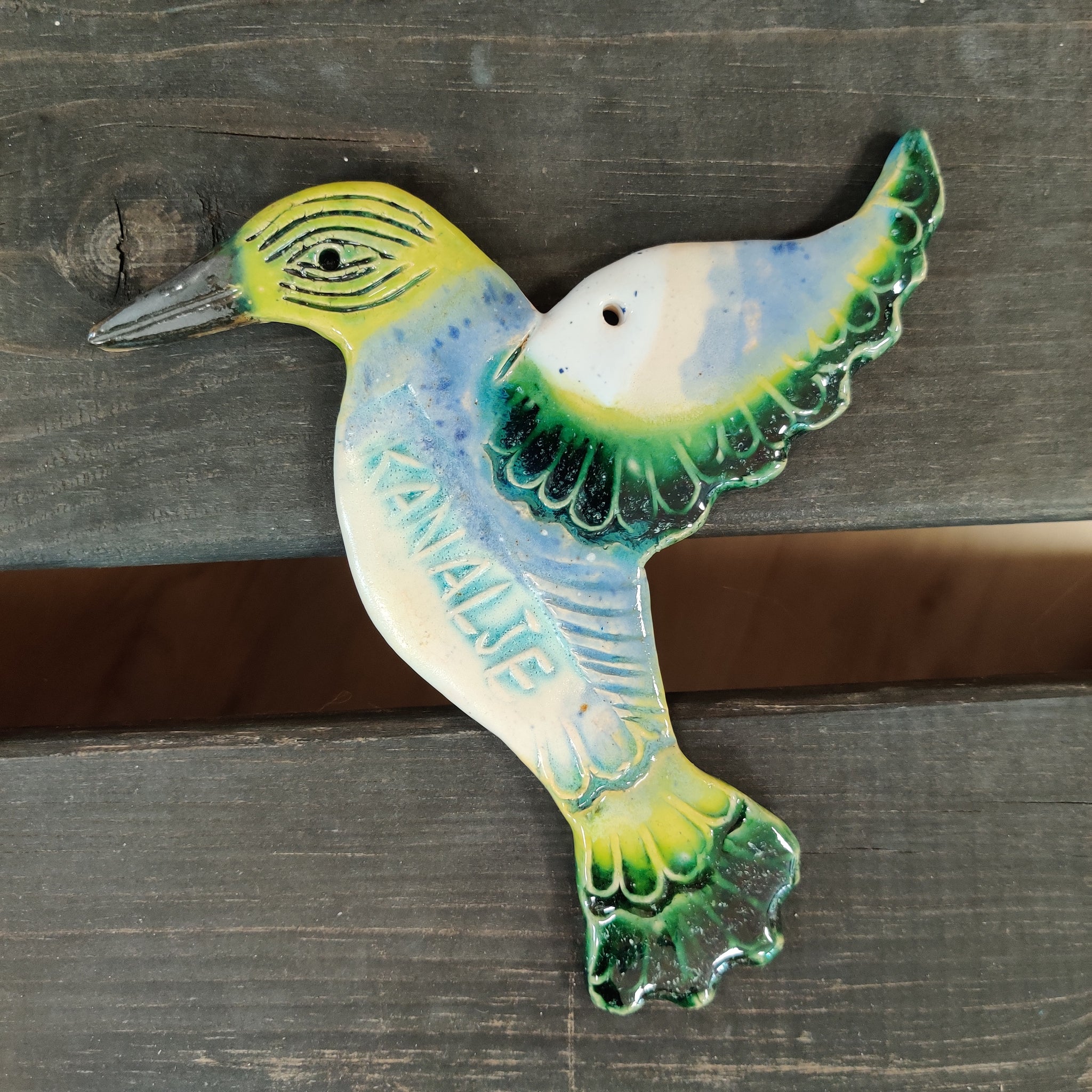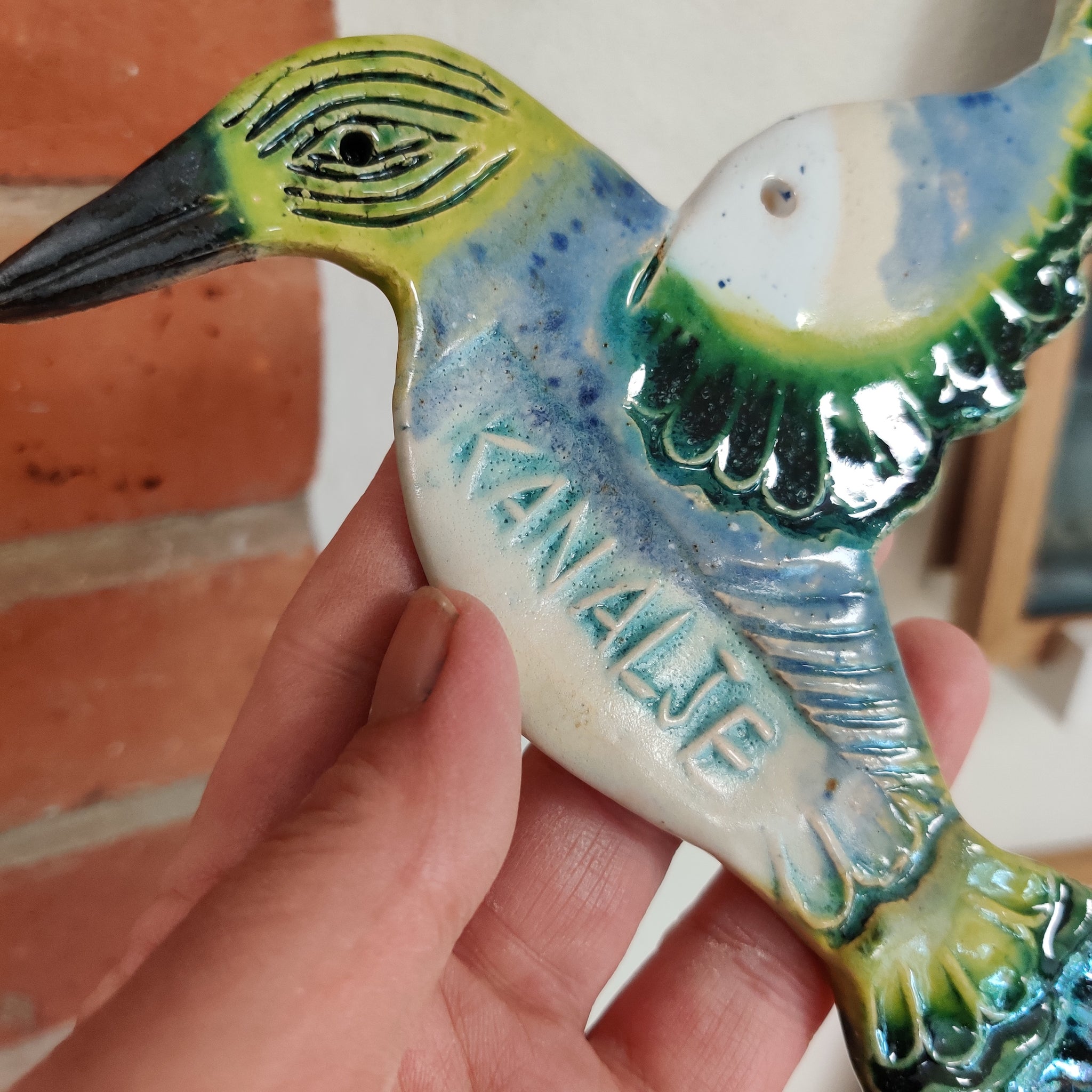 En fugl til at hænge på væggen. Den er i lertøj, glaseret på den ene side, og den er ca. 15 cm lang.