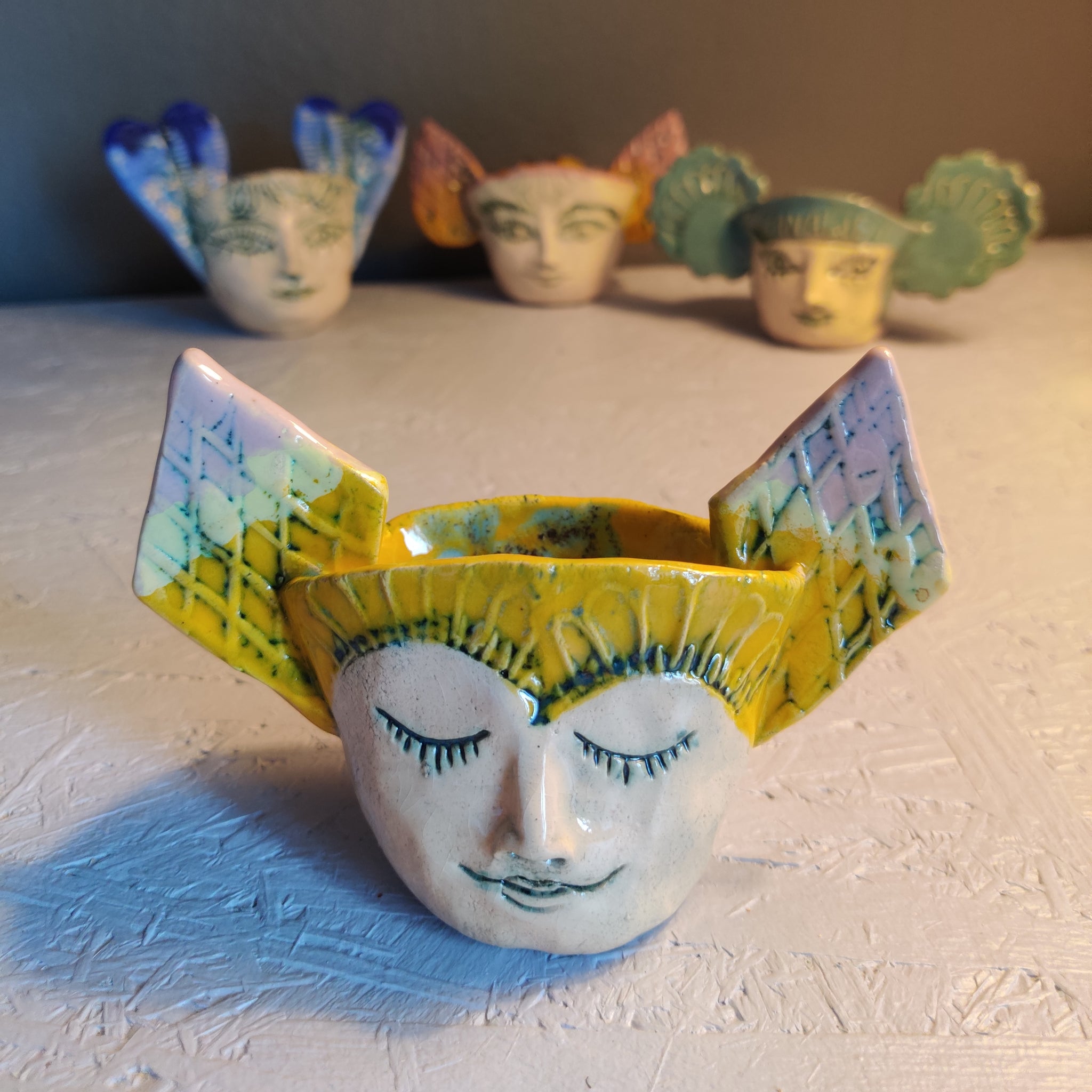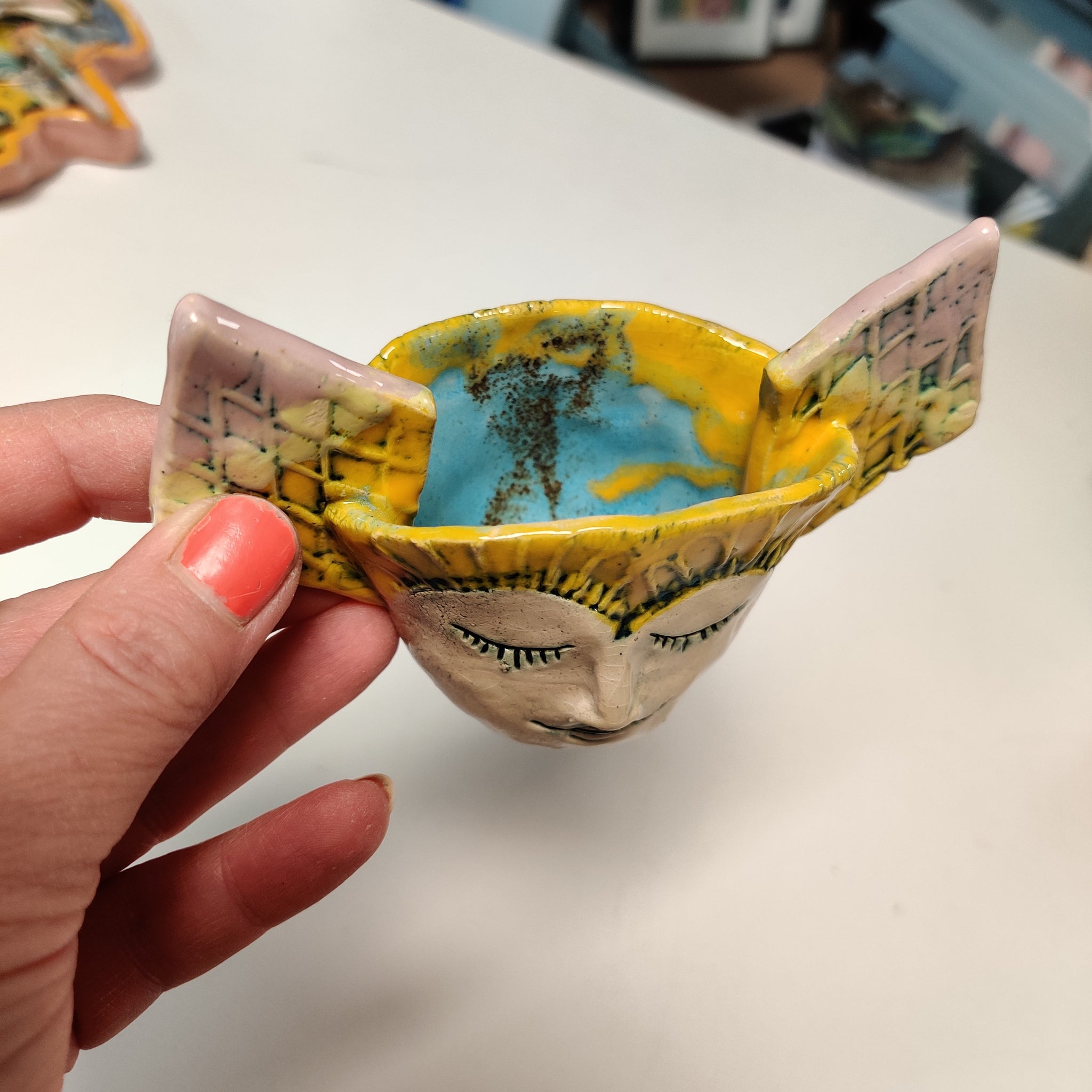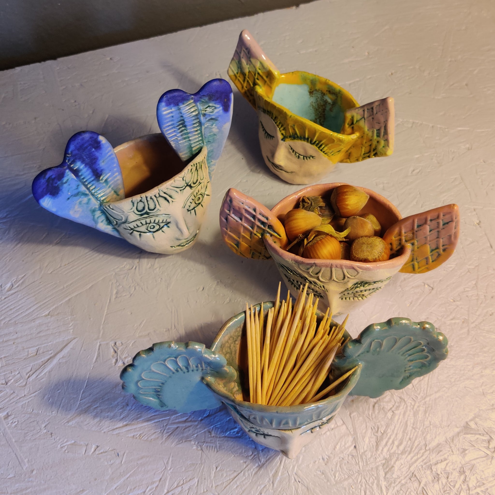 En skål i lertøj. Den kan bruges til nødder, sukker, salt, bolcher, tandstikker, smykker og meget mere. Den er ca. 12,5 cm bred (ydre mål)