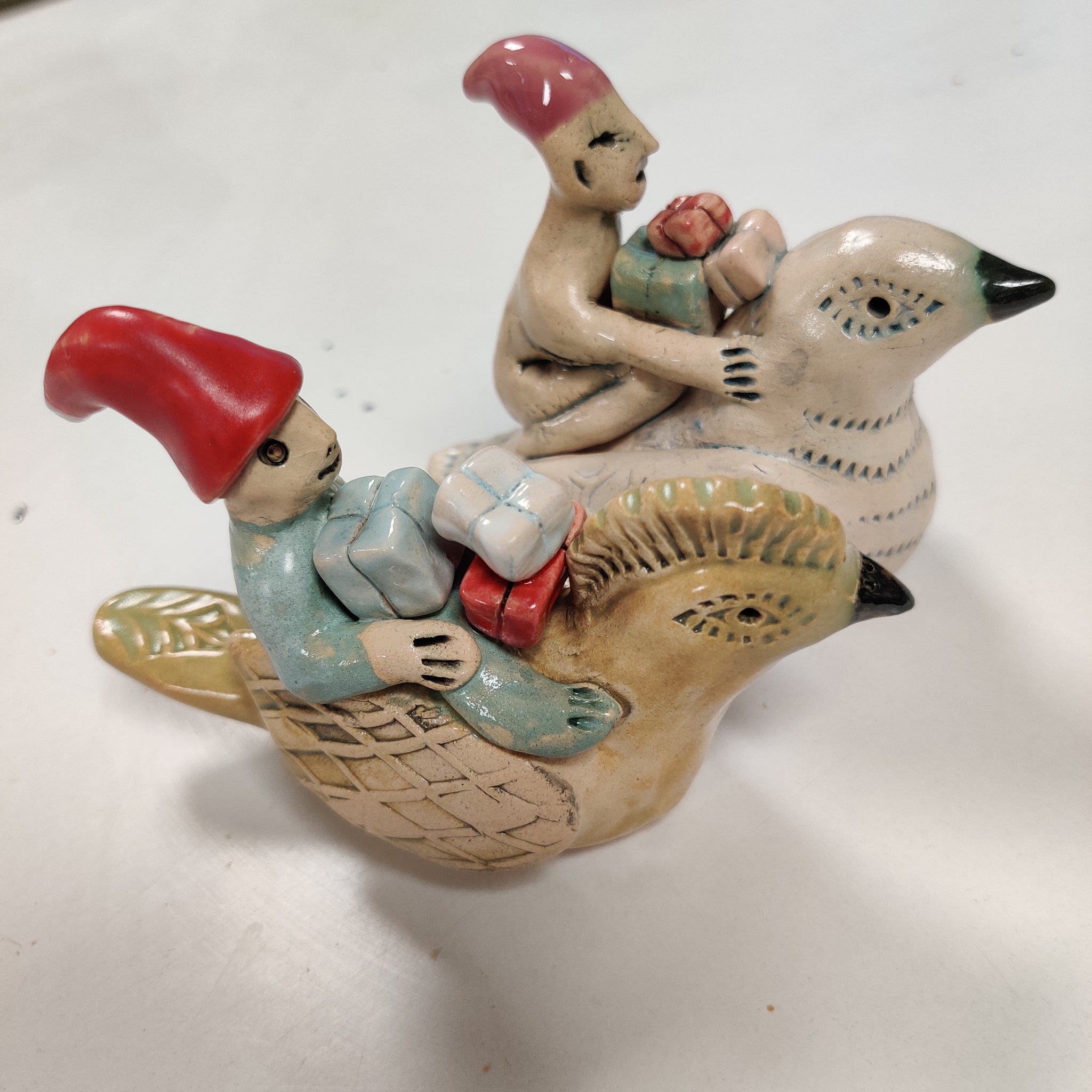 En lille skulptur i lertøj. Den måler ca. 12x8,5 cm.