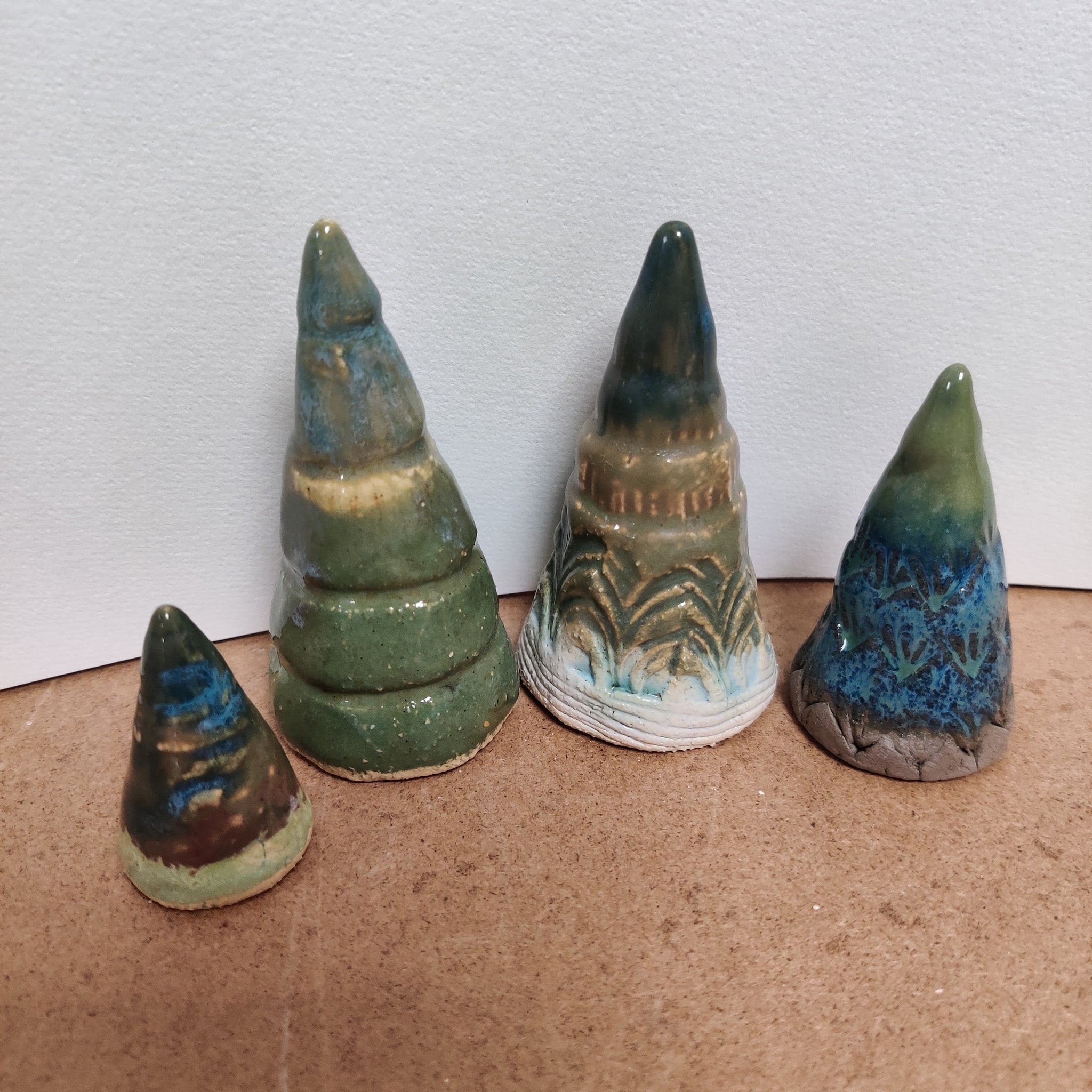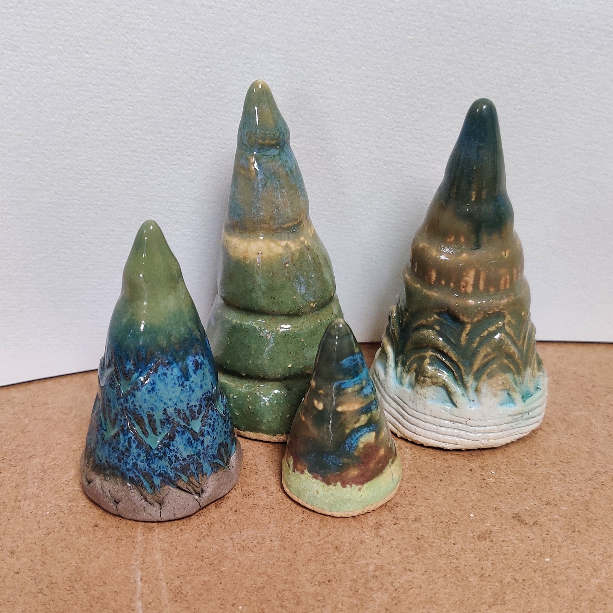 En gruppe af 4 unikke træer i lertøj. De er fra 4 - 8 cm høje