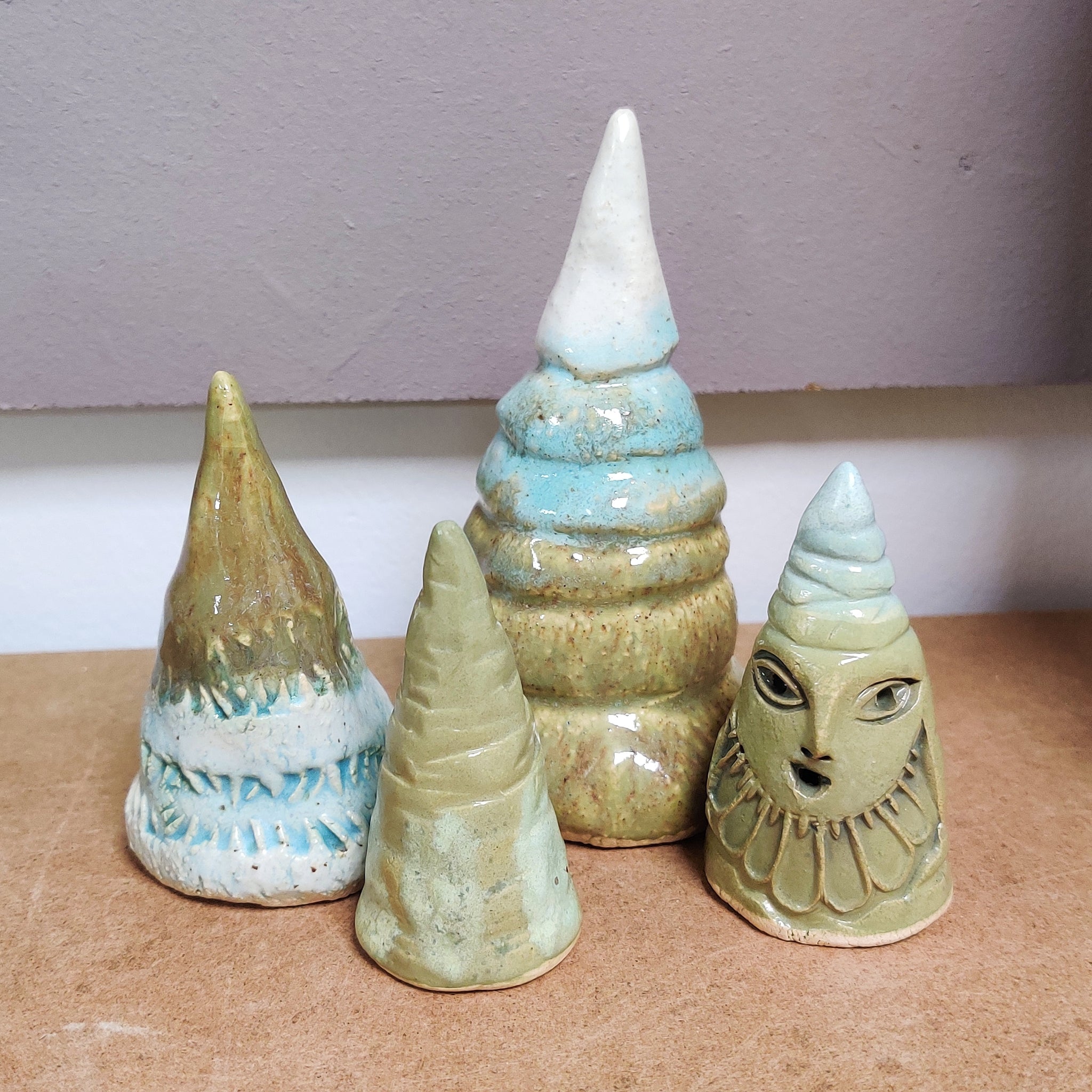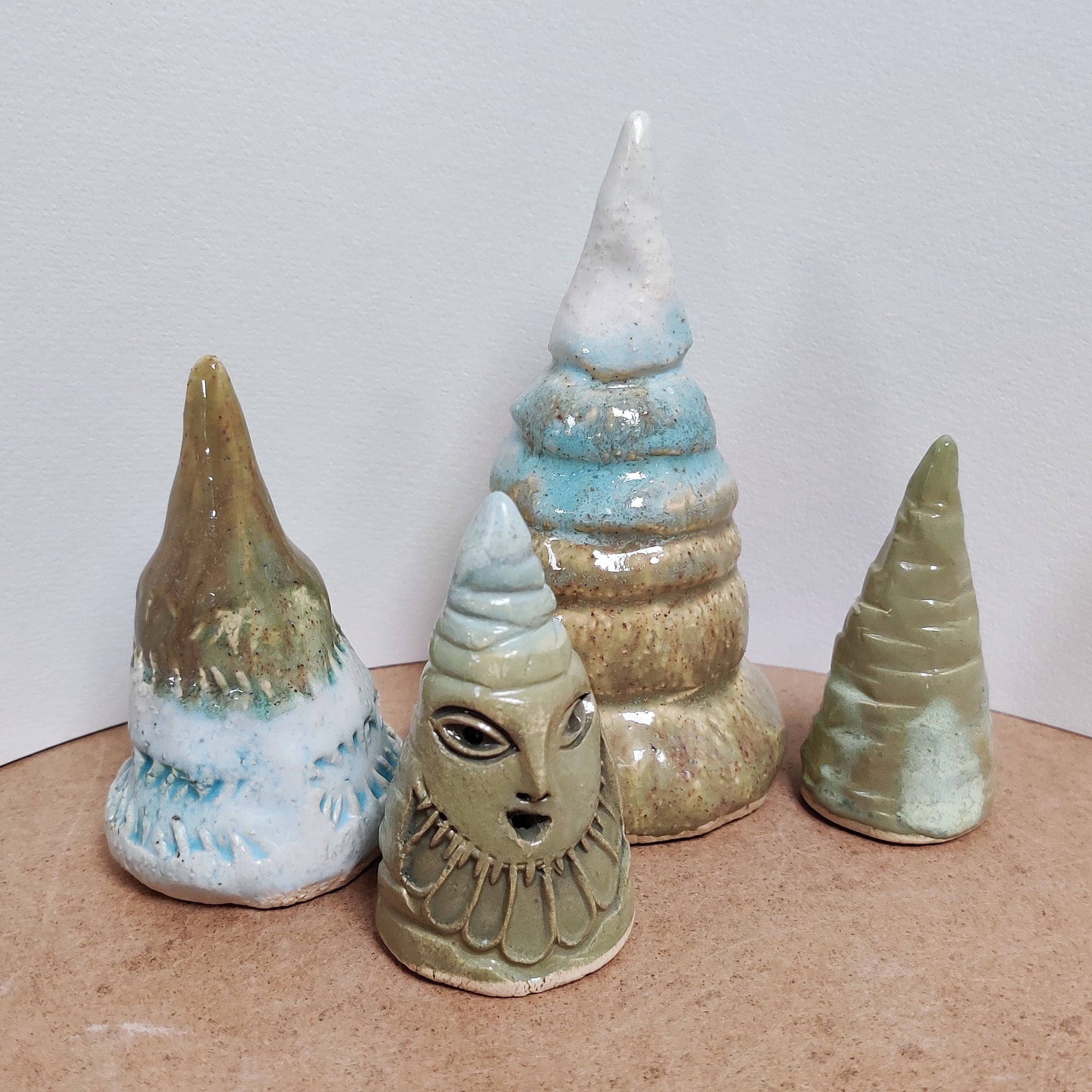 En gruppe af 4 unikke træer i lertøj. De er fra 6,5 - 11 cm høje