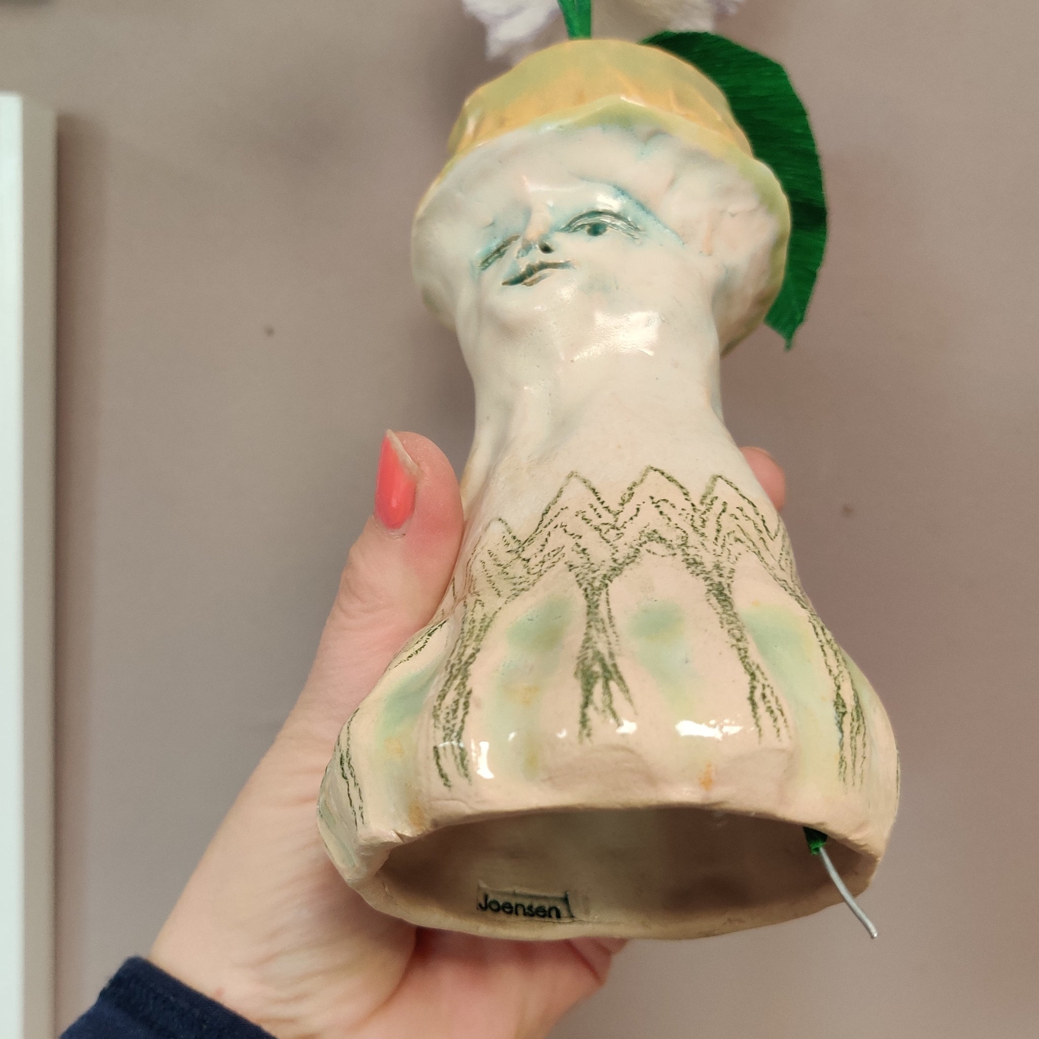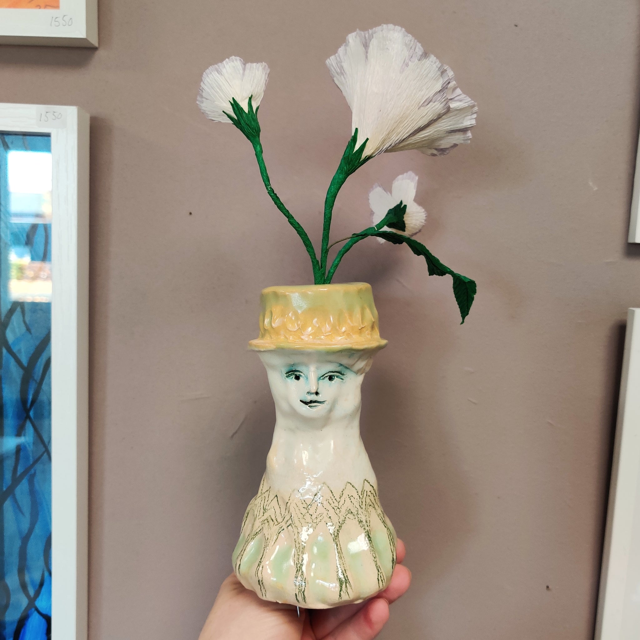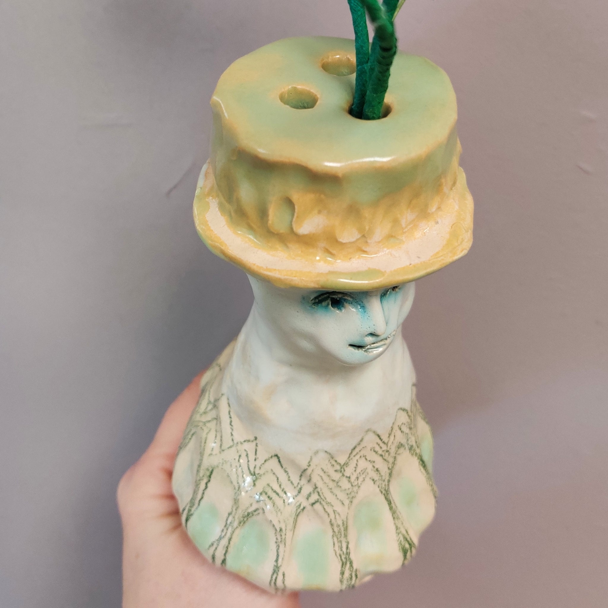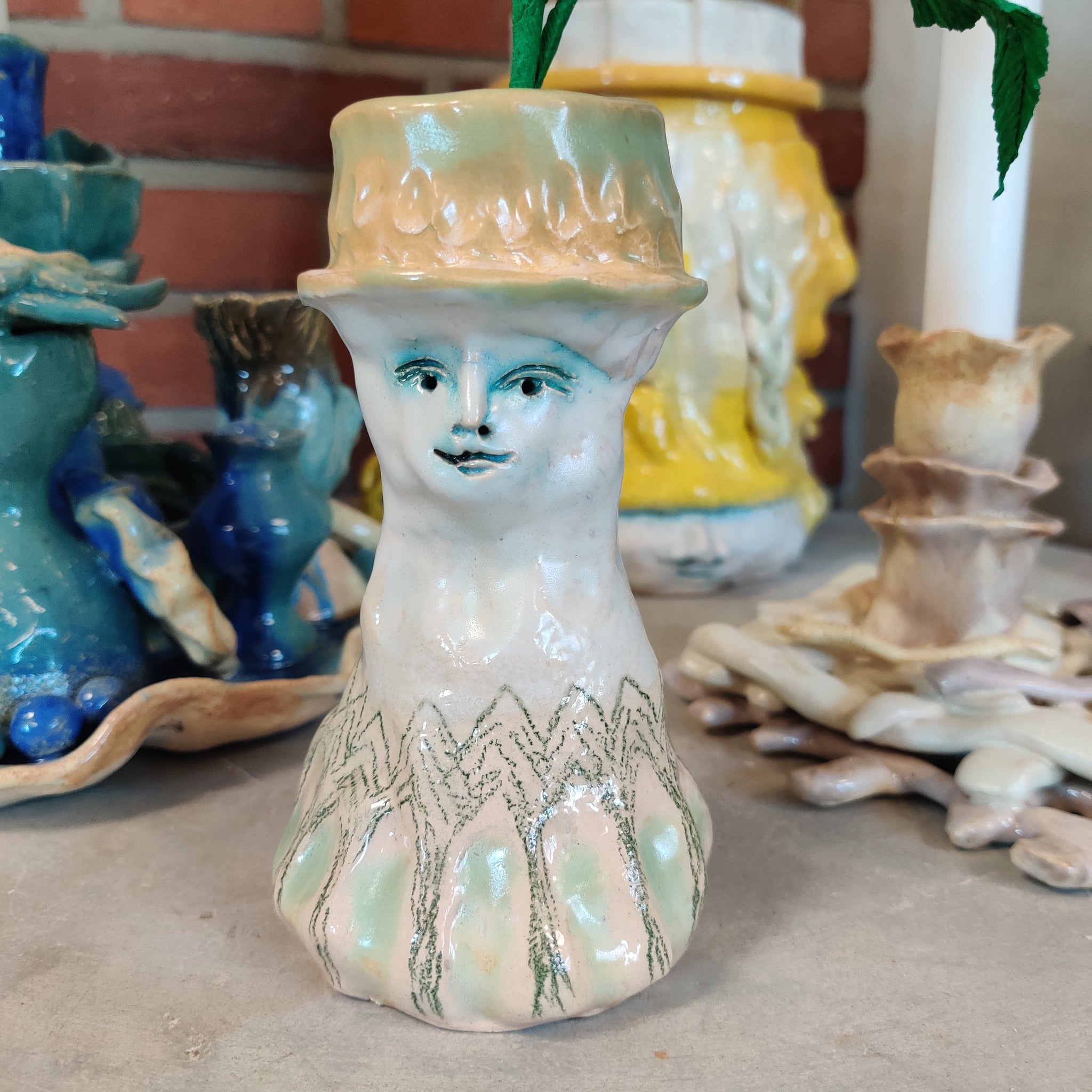 En skulptur med huller i hatten, som man kan placere f.eks. papirblomster i. Den er i lertøj og er ca. 15 cm høj.