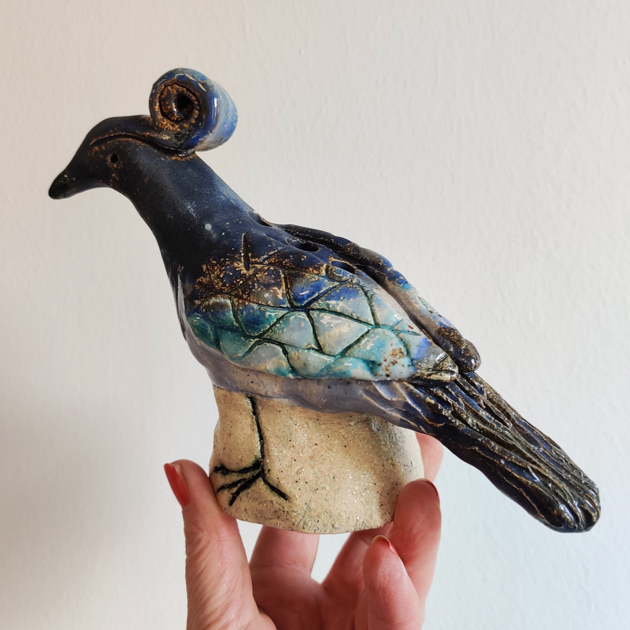 En fugl i lertøj. Den måler ca. 14x17 cm.