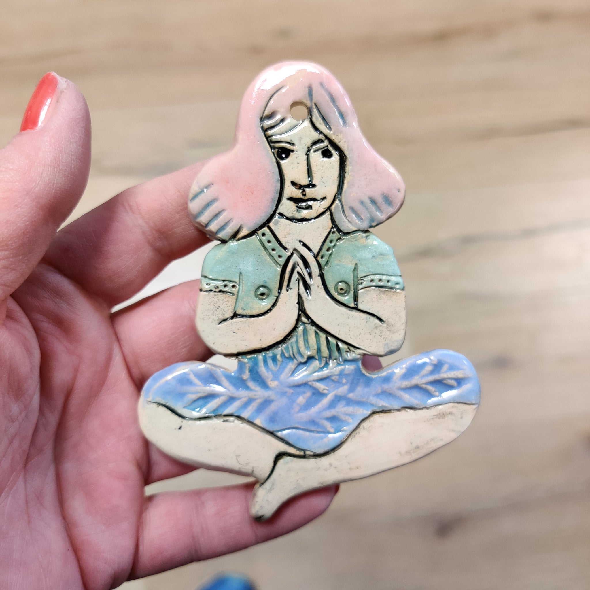 En yogadame i lertøj. Den er glaseret på den ene side, og har ligeså et motiv på bagsiden, så den kan hænge frit på en gren eller lignende. Den er ca. 10,5 cm lang.