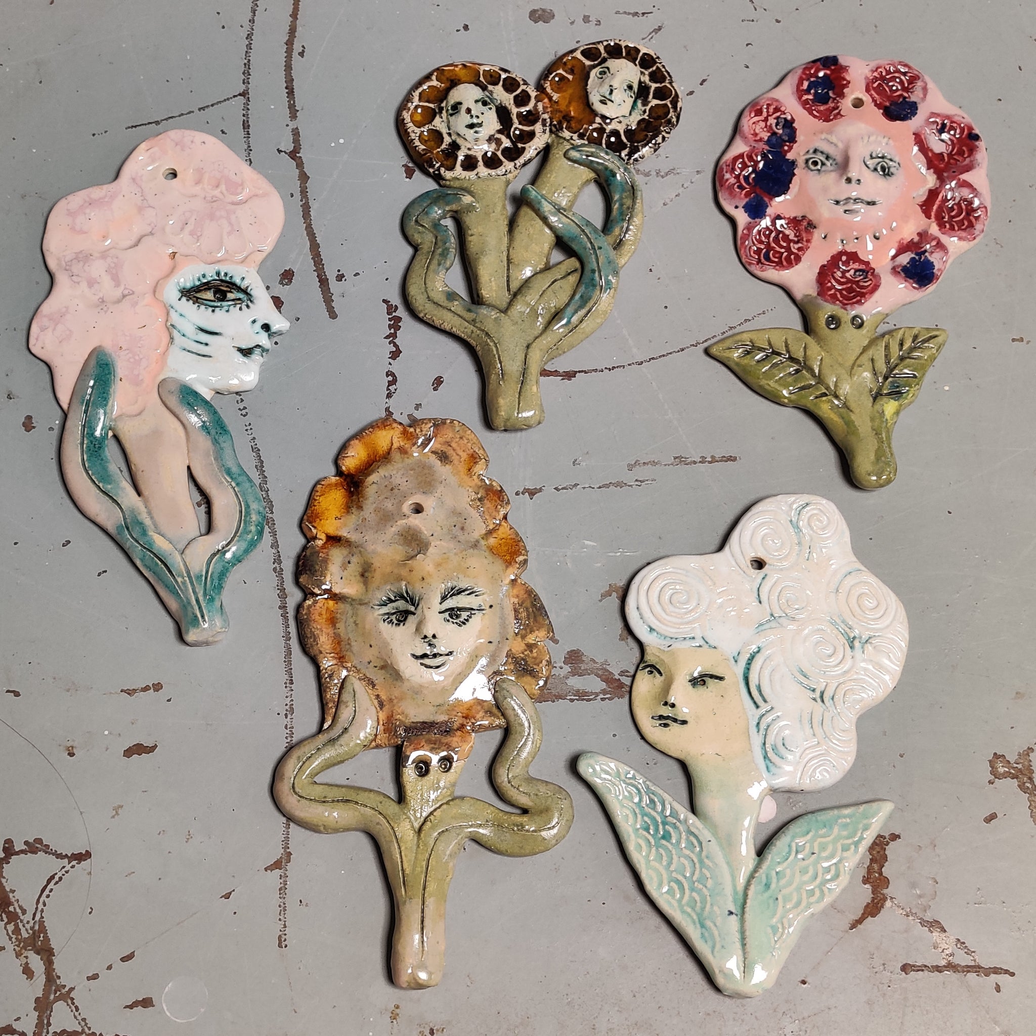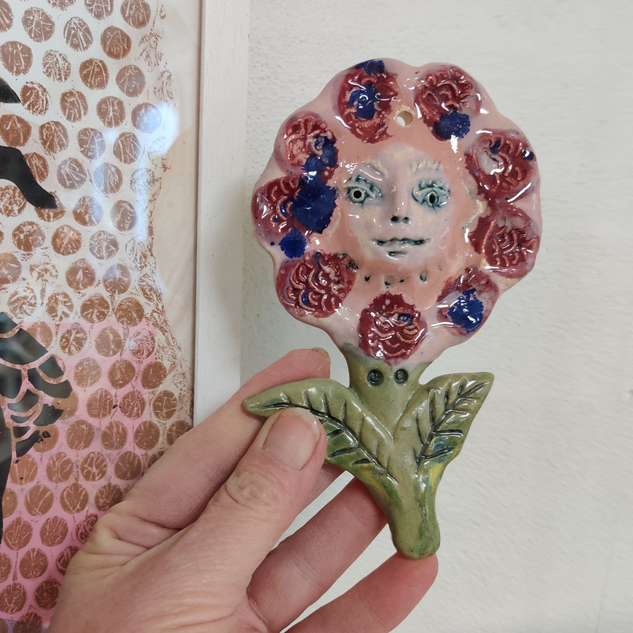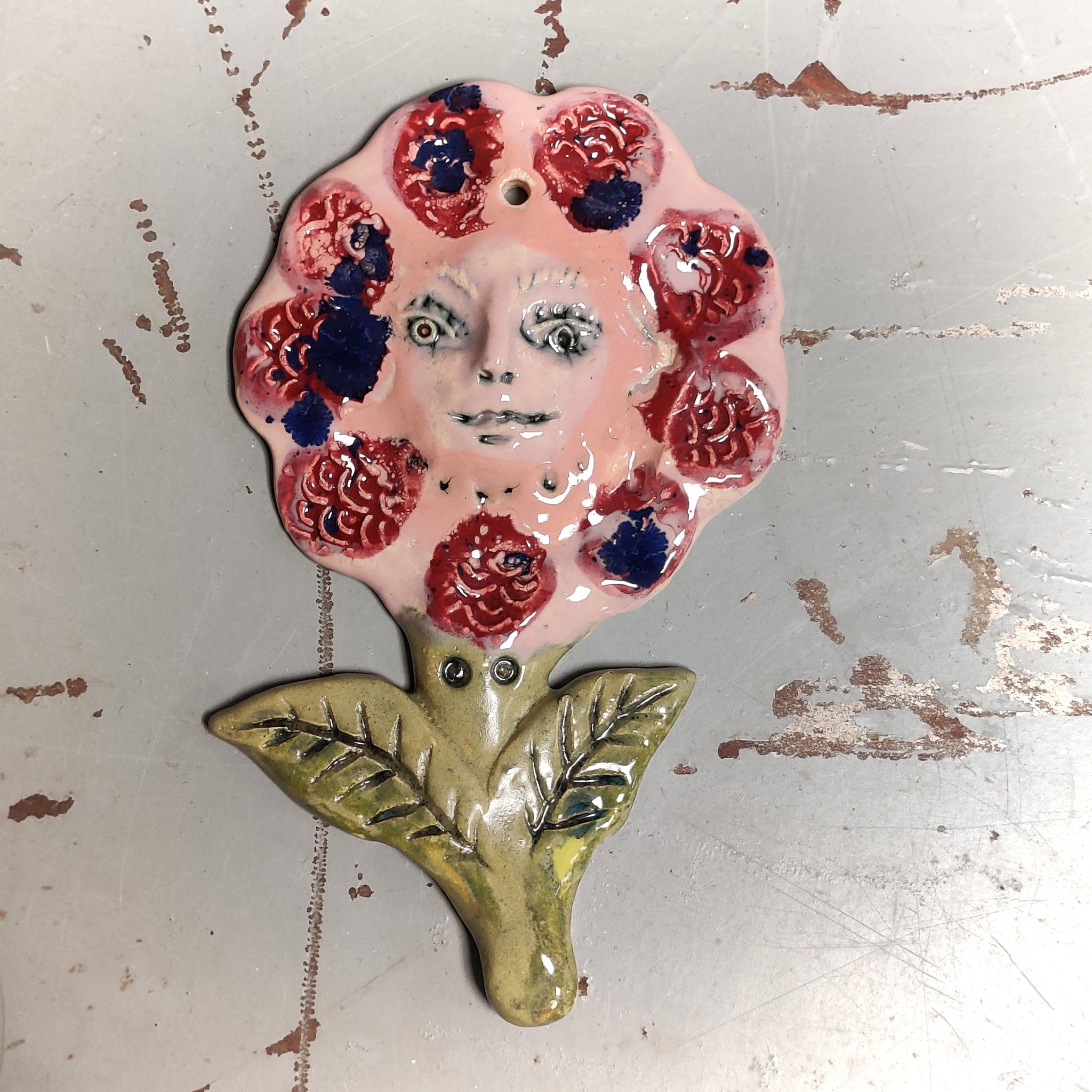 En væghængt evighedsblomst i lertøj. Den er glaseret på den ene side, og den er ca. 14 cm lang.