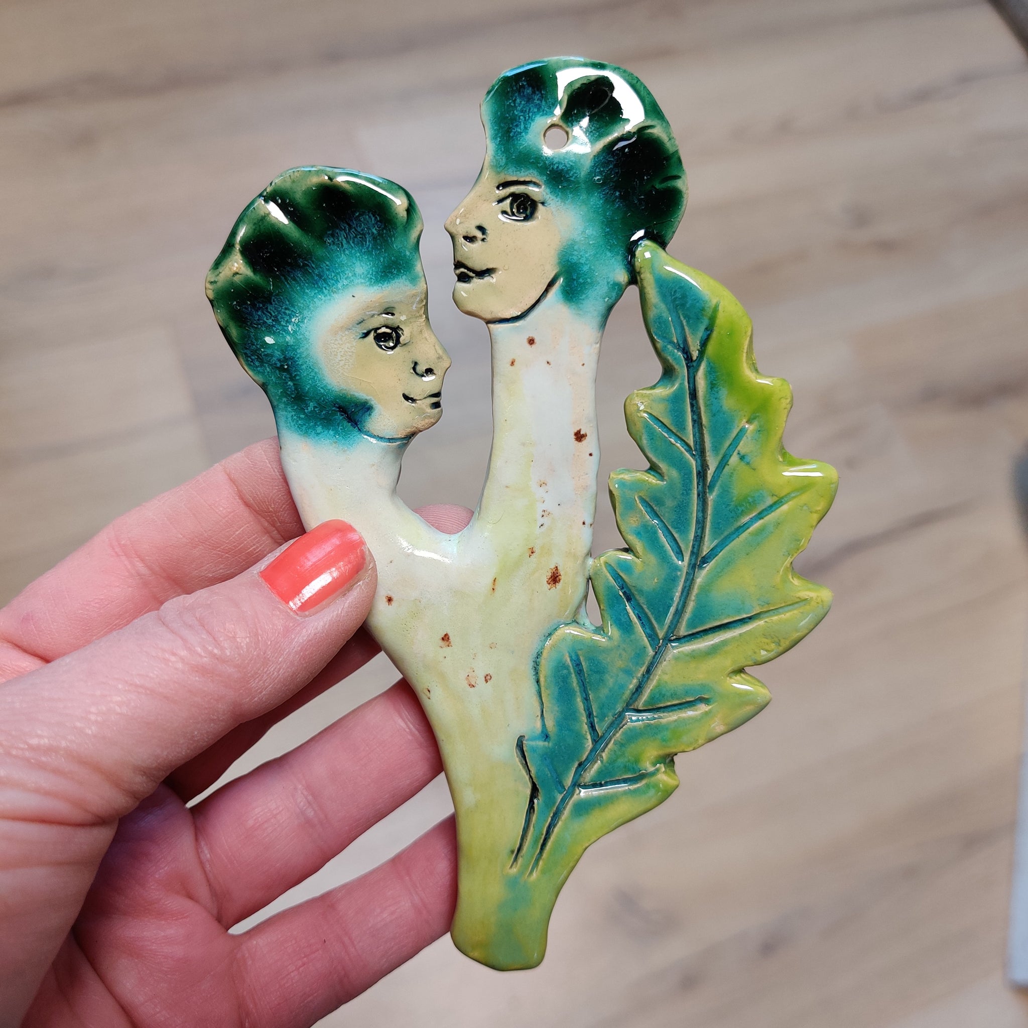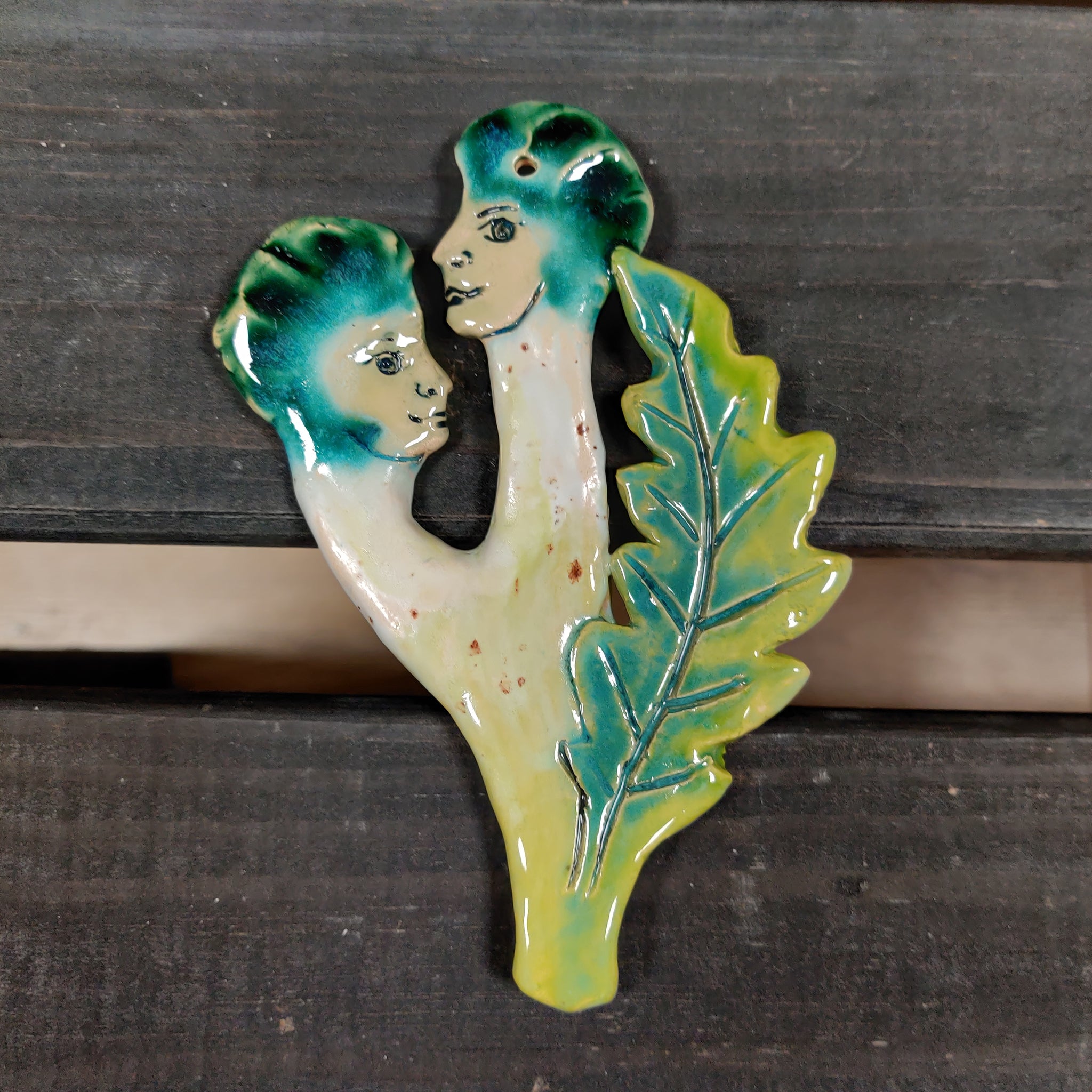 En væghængt evighedsblomst i lertøj. Den er glaseret på den ene side, og den er ca. 13-14 cm lang.