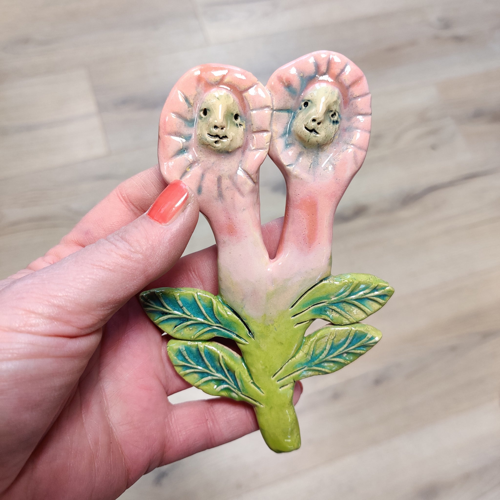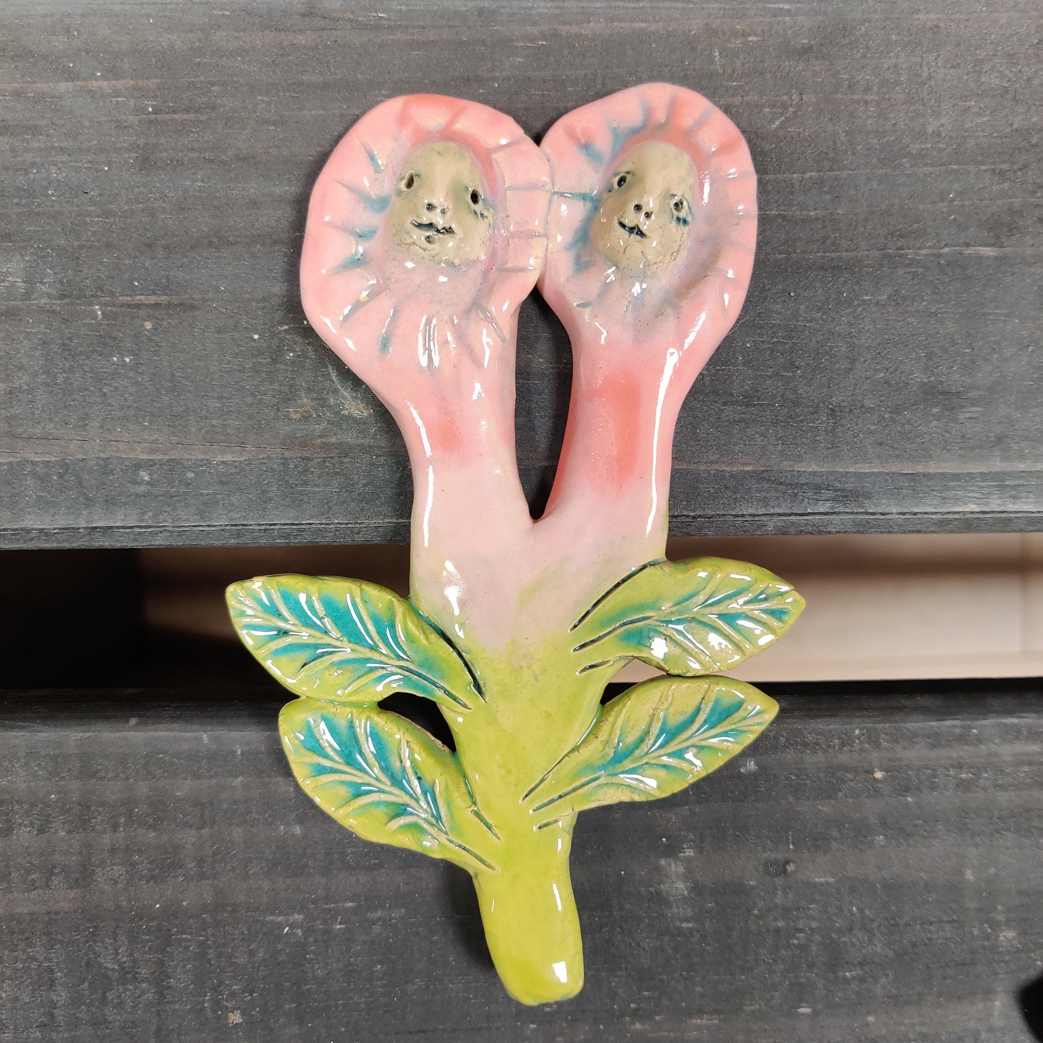 En væghængt evighedsblomst i lertøj. Den er glaseret på den ene side, og den er ca. 13-14 cm lang.