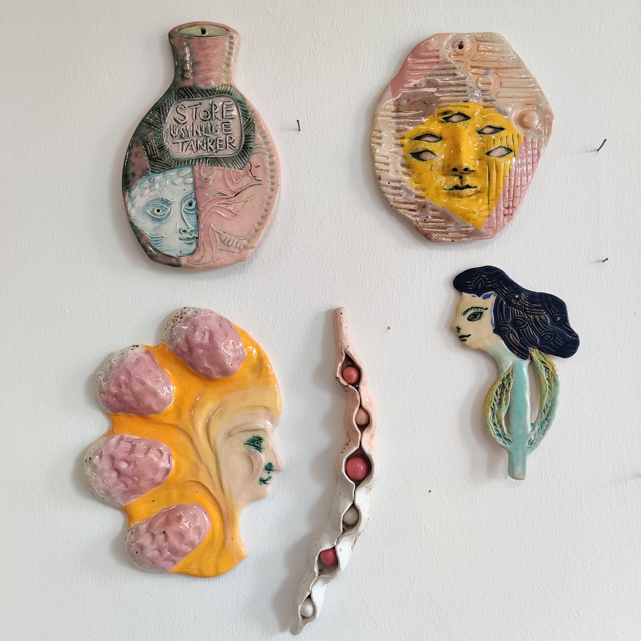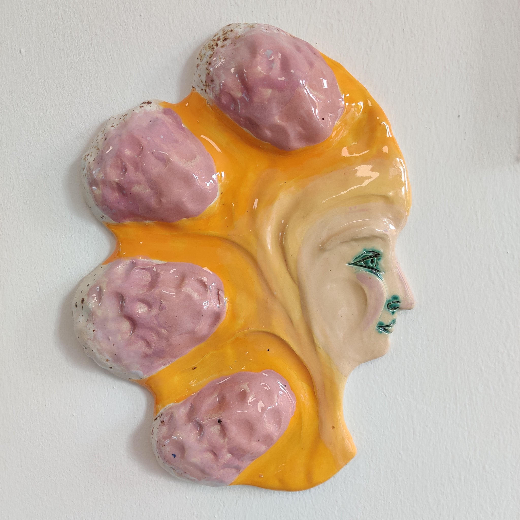 Et objekt til at hænge på væggen. Det er i lertøj, glaseret på den ene side og måler ca.21x16cm