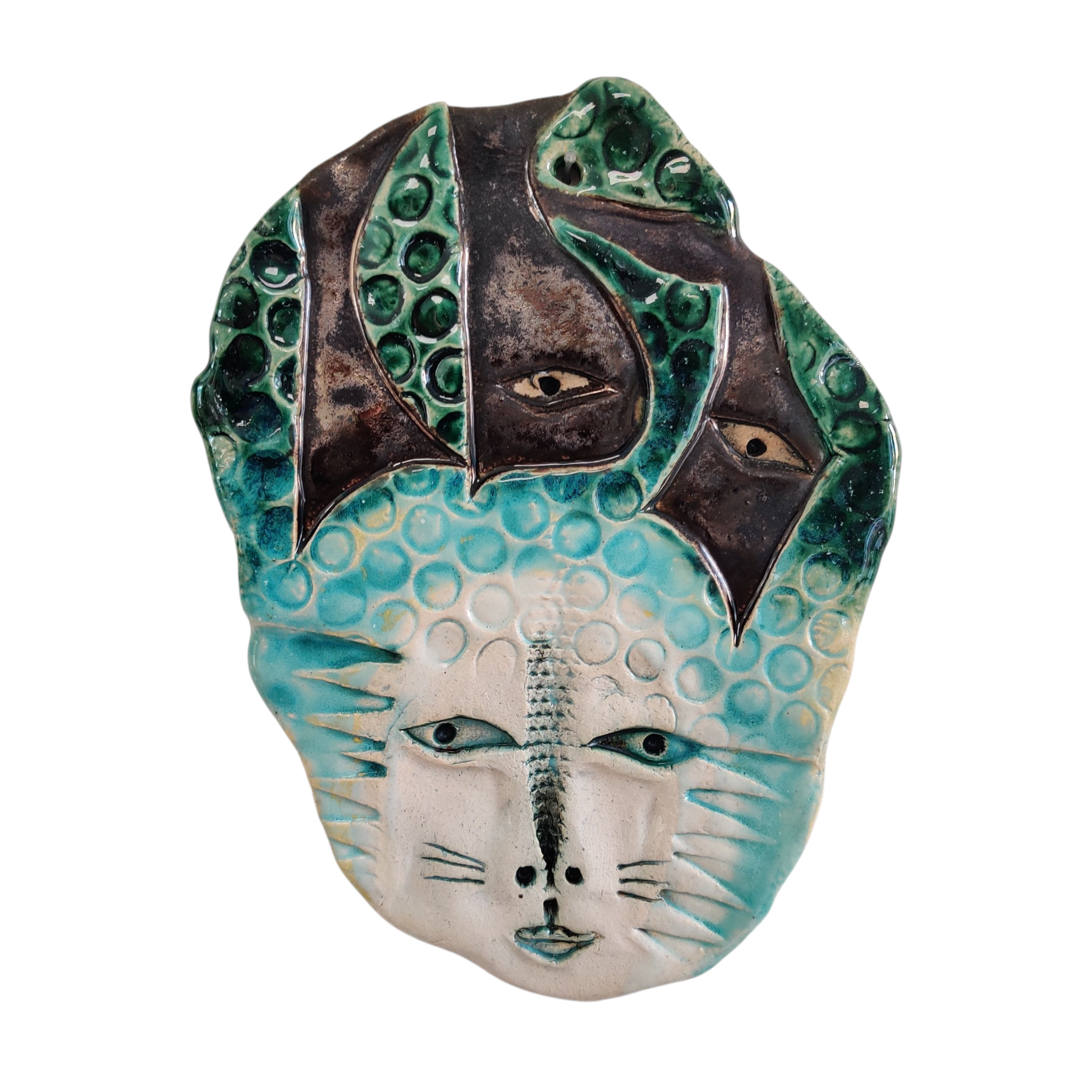 Et objekt til at hænge på væggen. Det er i lertøj, glaseret på den ene side og måler ca.17,5x13cm