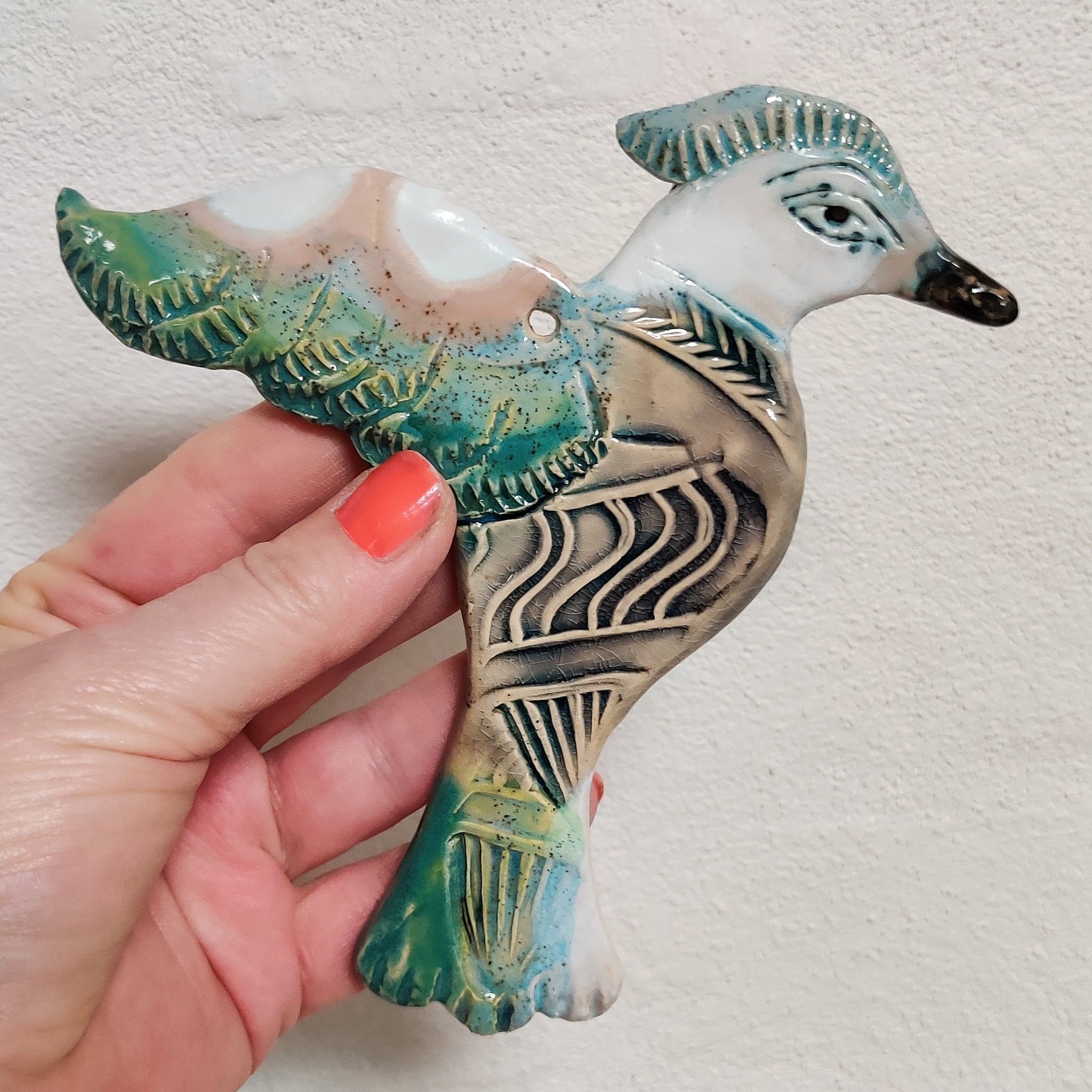 En fugl til at hænge på væggen. Den er i lertøj, glaseret på den ene side, og den er ca. 15 cm lang.