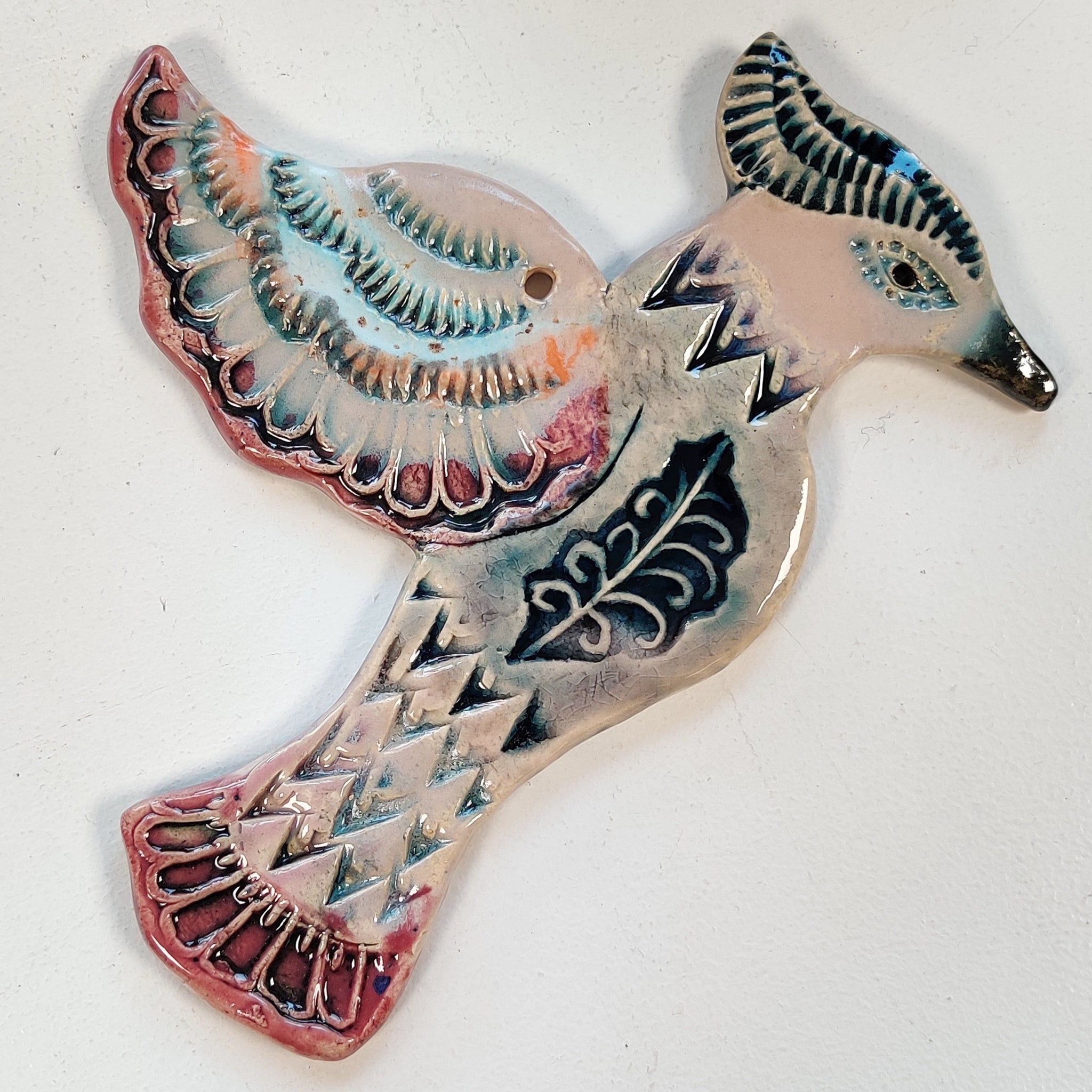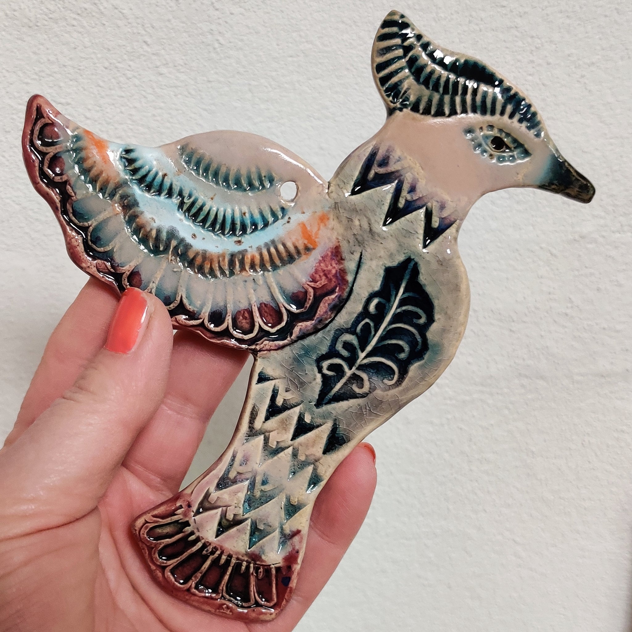 En fugl til at hænge på væggen. Den er i lertøj, glaseret på den ene side, og den er ca. 15 cm lang.