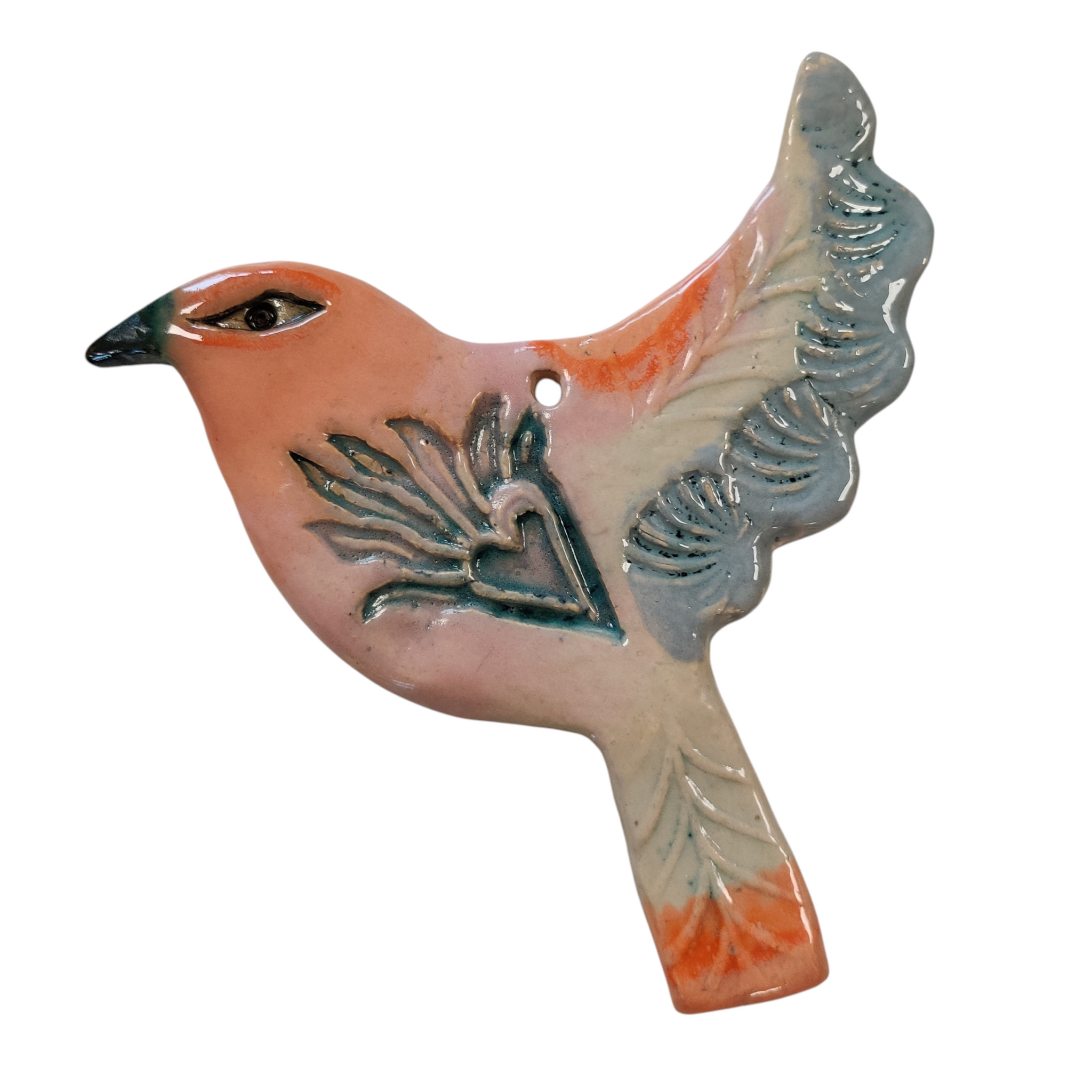 En fugl til at hænge på væggen. Den er i lertøj, glaseret på den ene side, og den er ca. 12 cm lang.