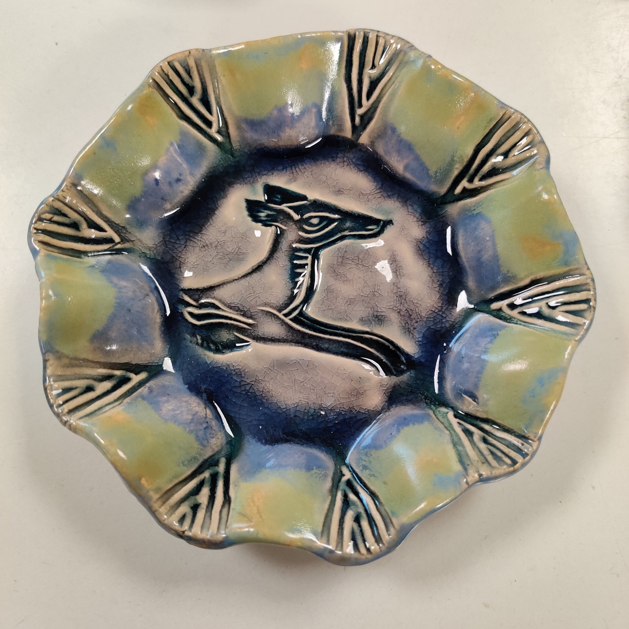 Et lille fad/en lille skål i lertøj. Den er ca. 12 cm i diameter. Den er velegnet til smykker, småkager, hårelastikker, nødder og meget mere.