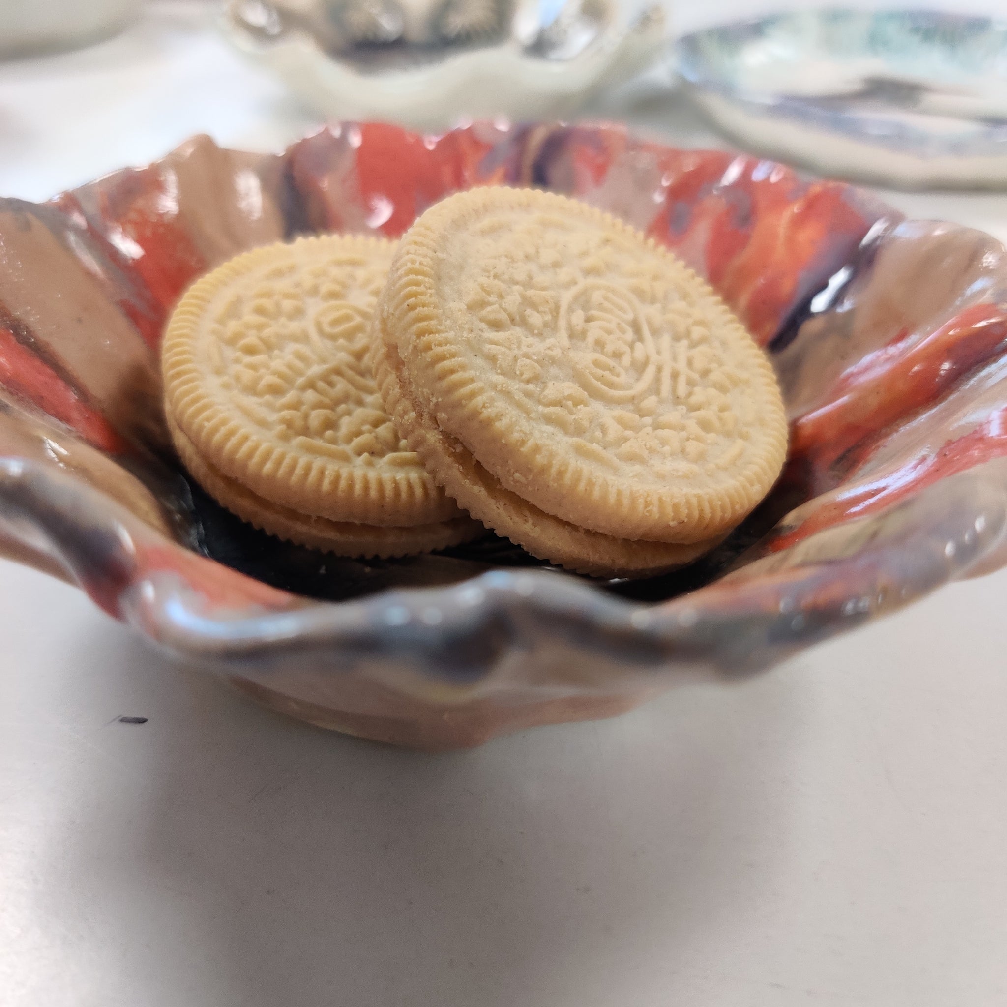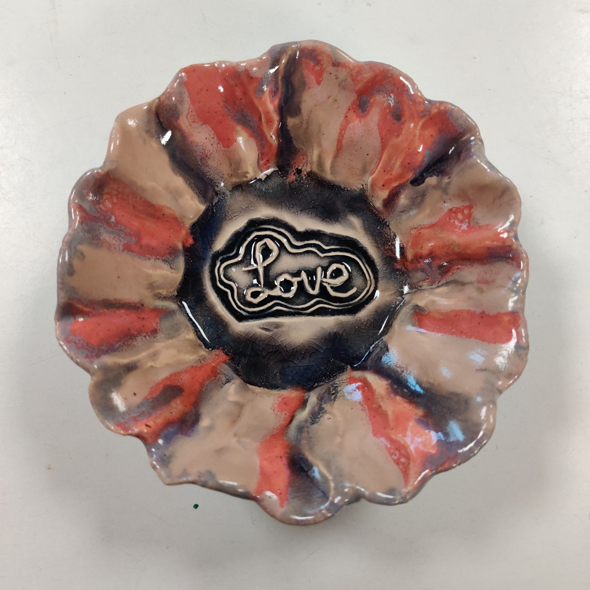 Et lille fad/en lille skål i lertøj. Den er ca. 11,5 cm i diameter. Den er velegnet til smykker, småkager, hårelastikker, nødder og meget mere.