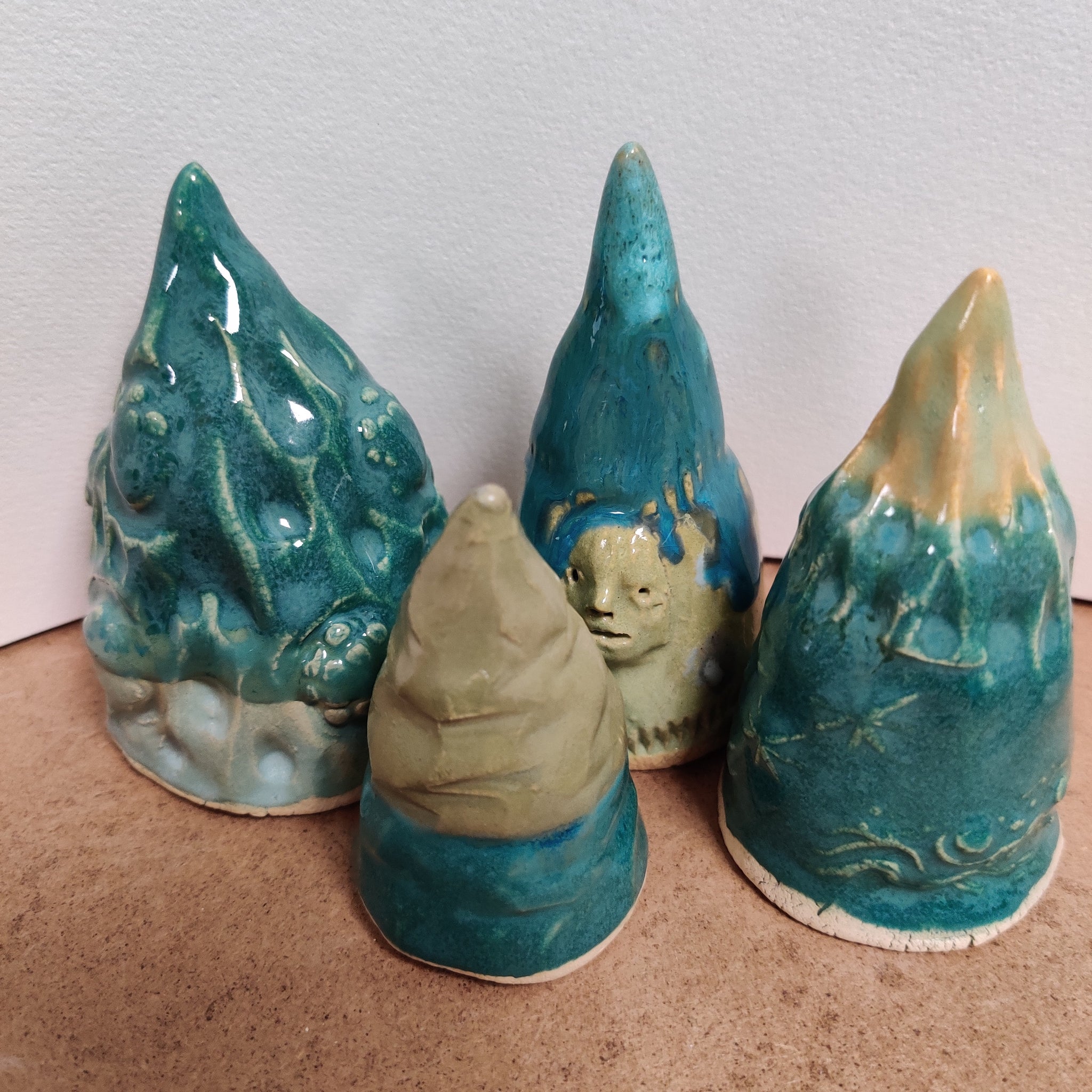 En gruppe af 4 unikke træer i lertøj. De er fra 5,5- 8,5 cm høje