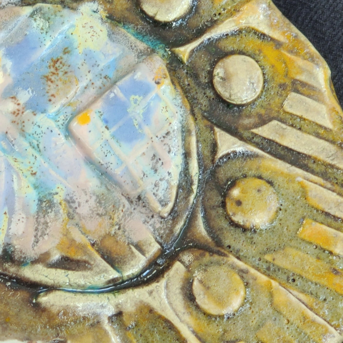 Et objekt til at hænge på væggen. Det er i lertøj, glaseret på den ene side og måler ca.17x14 cm