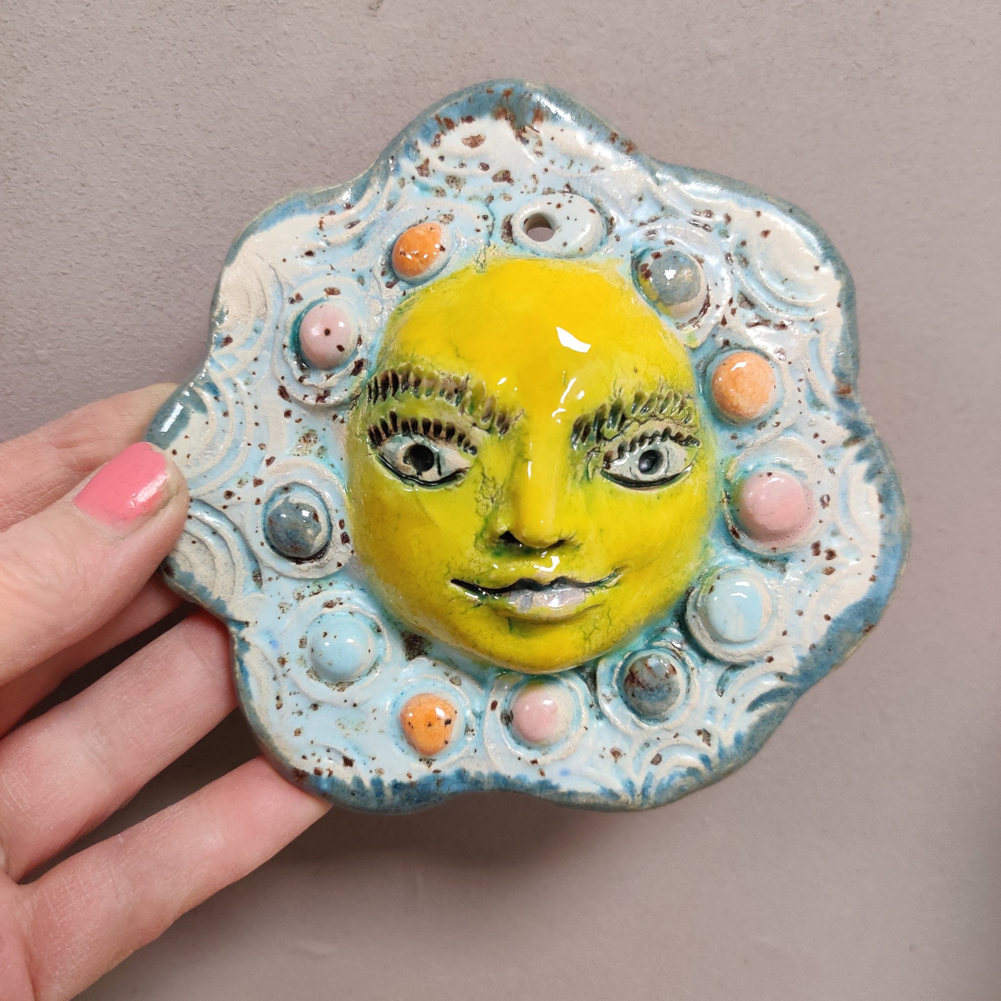 En væghængt sol i lertøj. Den måler ca. 11x12 cm