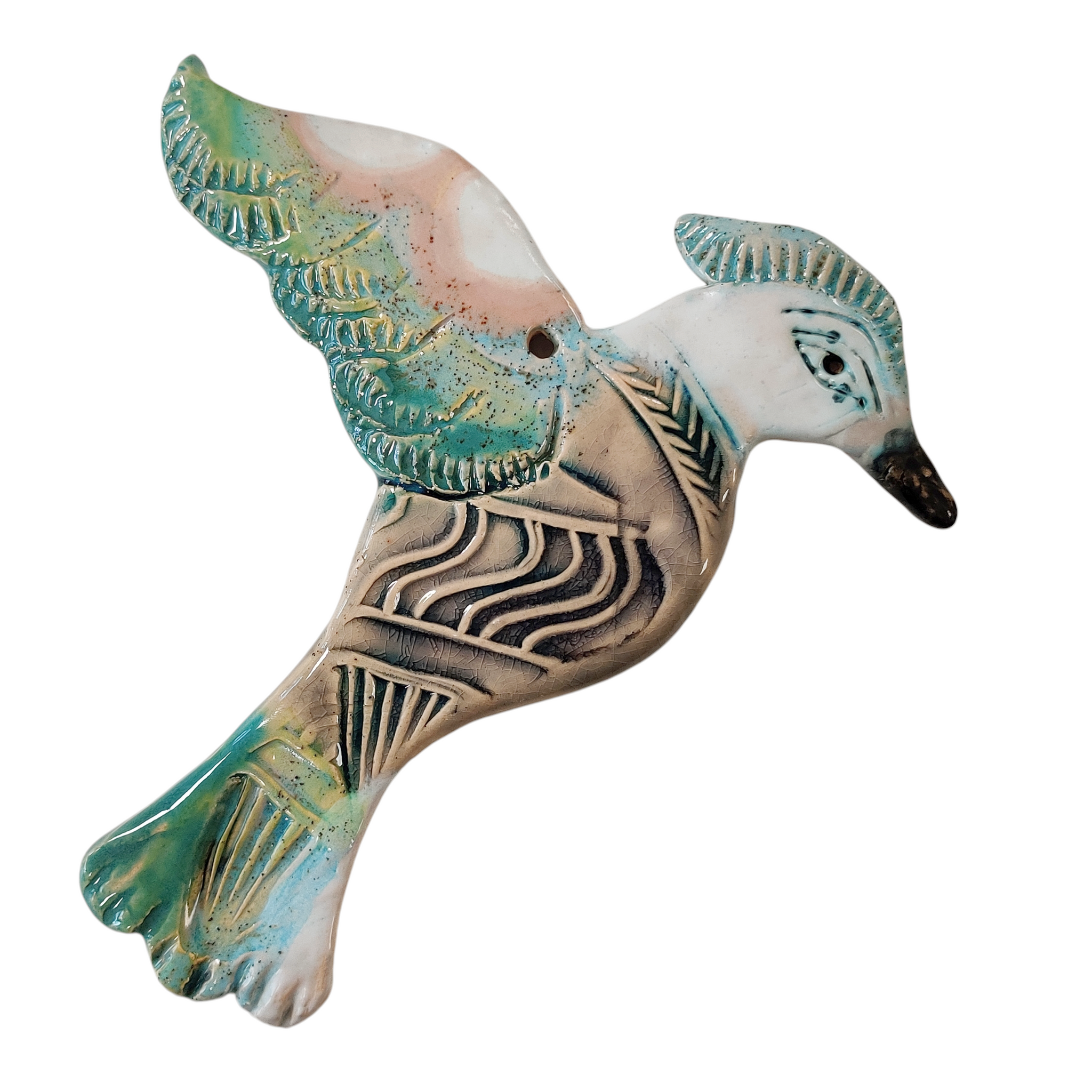 En fugl til at hænge på væggen. Den er i lertøj, glaseret på den ene side, og den er ca. 15 cm lang.